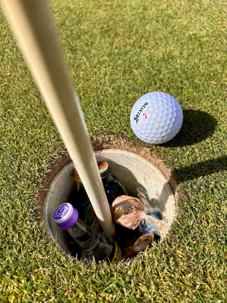 Schon beim ersten Abschlag wartete die erste Überraschung auf alle Teilnehmenden. Für jede Golferin und jeden Golfer gab es einen Lindt GOLDHASEN – natürlich der mit Glöckchen um den Hals. Vor dem ersten Einlochen musste das Loch von Süßigkeiten und edlen Tröpfchen „befreit“ werden. Danach war das Einlochen überhaupt erst möglich.